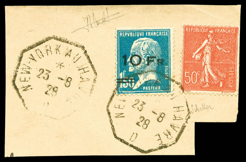 Berthelot et Pasteur surchargée à bord du paquebot 'Ile de France' + Poste N°199 (3) et 235, tous oblitérés cachet à date octogonal NEW-YORK AU HAVRE 23/8/28 sur lettre recommandée Par Avion, très jolie pièce, SUPERBE. R.R. (signé Brun/certificats)