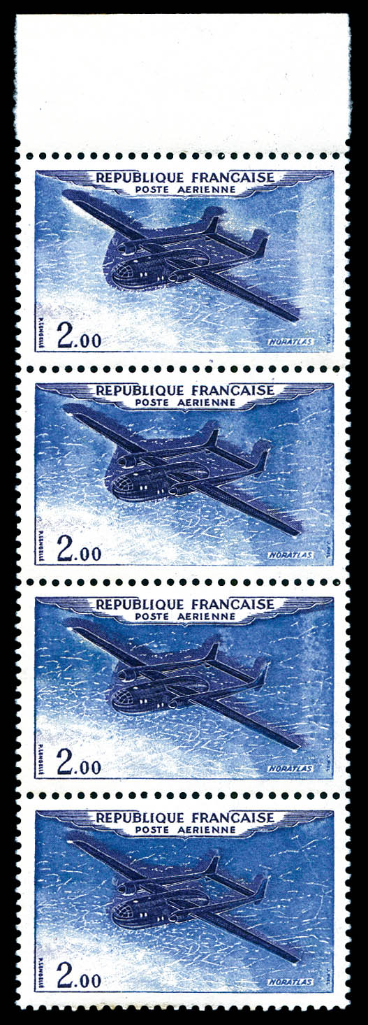 Nordatlas, Spectaculaire variété comprenant 1 exemplaire impression sans le fond tenant 3 exemplaires impression dépouillée avec avion 'en feu', bord de feuille. SUPERBE. R.R. (signé Scheller/certificat) Qualité: ** (Image)