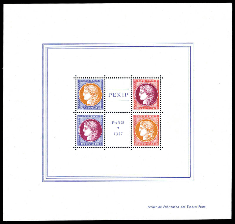 Emis: Exposition philatélique de 1937, bloc composé de 4 timbres dentelés avec couleurs différentes, FRAÎCHEUR POSTALE, GRANDE RARETE, SUPERBE (certificat) Qualité: **