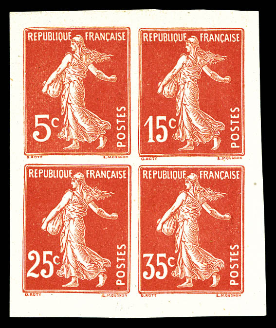 Emis, projet pour bloc PEXIP: Semeuse 5c + 15c + 25c + 35c, rouge en bloc de quatre non dentelé (2ex *). SUPERBE. R.R. (Certificat) Qualité: ** (Image)