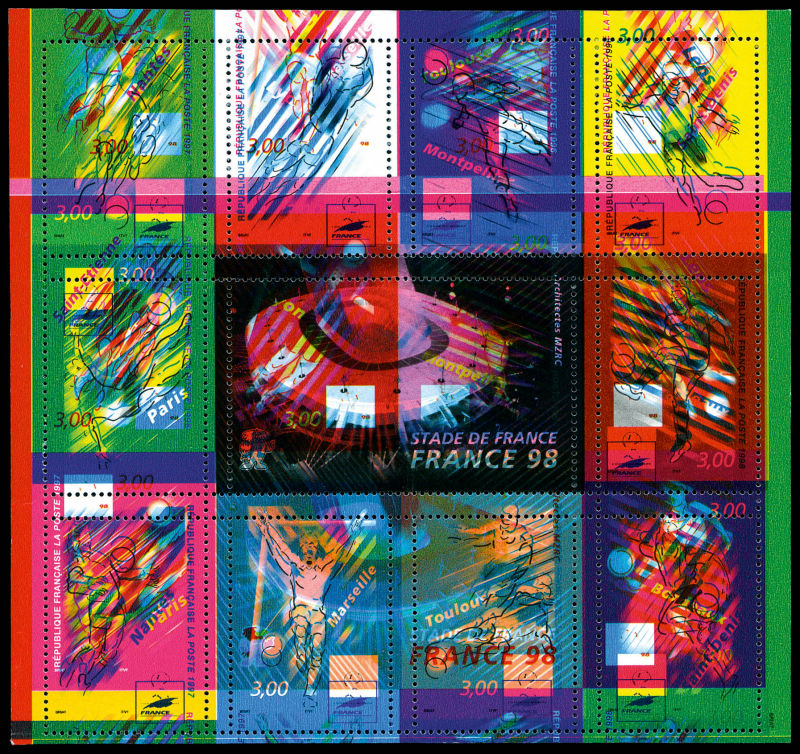du Monde de Football 1998, Très fort décalage vertical des couleurs et du texte. 3 Blocs connus. SUPERBE. R.R.R. (signé Scheller/certificats) Qualité: ** (Image) (image2)