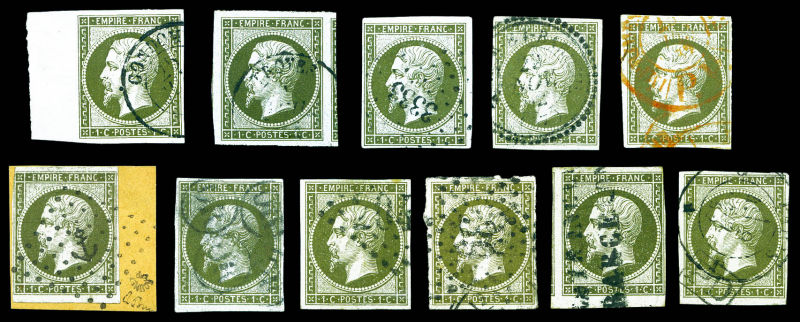 de onze n°11 1c olive avec oblitérations variées : Ancre, OR dans cercle (signé Calves), CaD rouge des imprimés, PC 3333 (signé Calves), GC, CaD T15 BdF, CaD 15 avec voisin (signé JF.Brun), CaD T22, PD + càd Paris, obl. Barcelona avec voisin, en