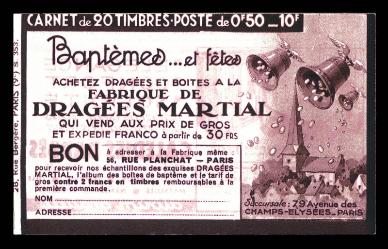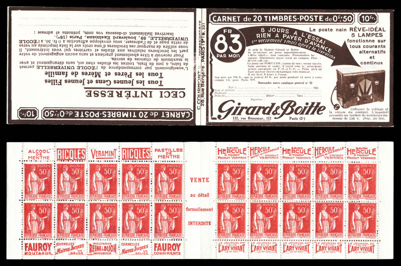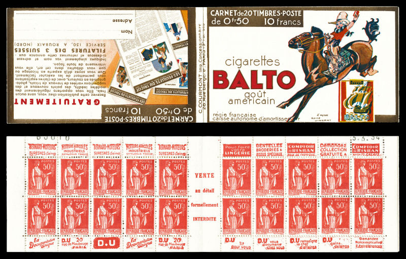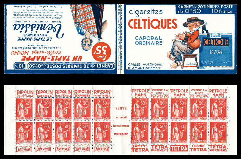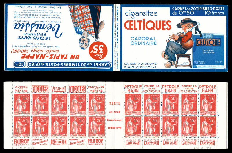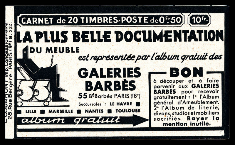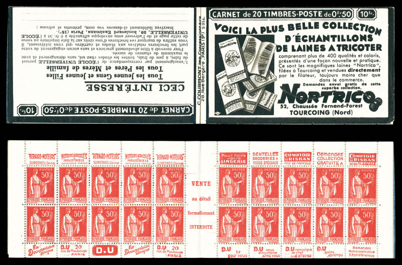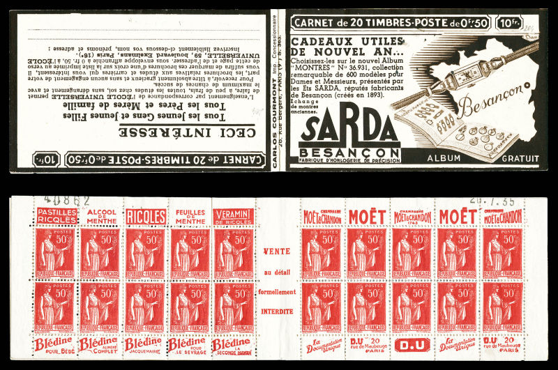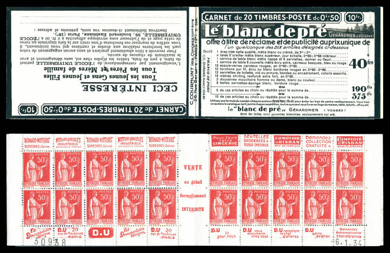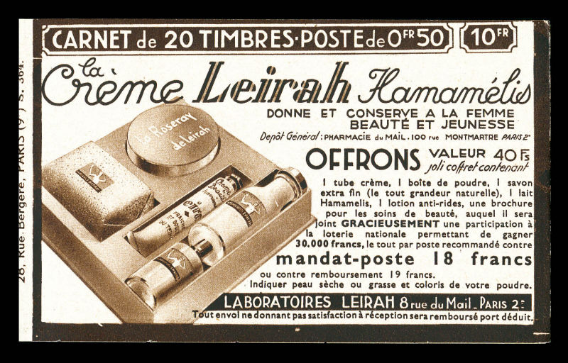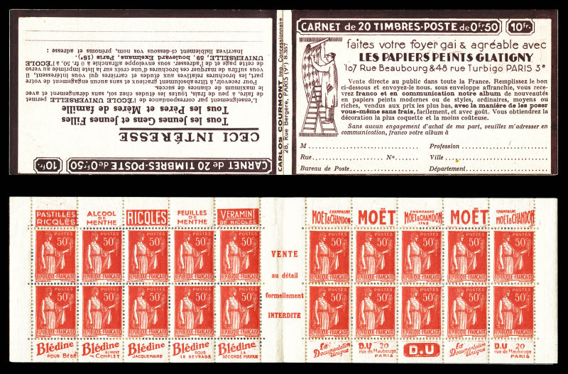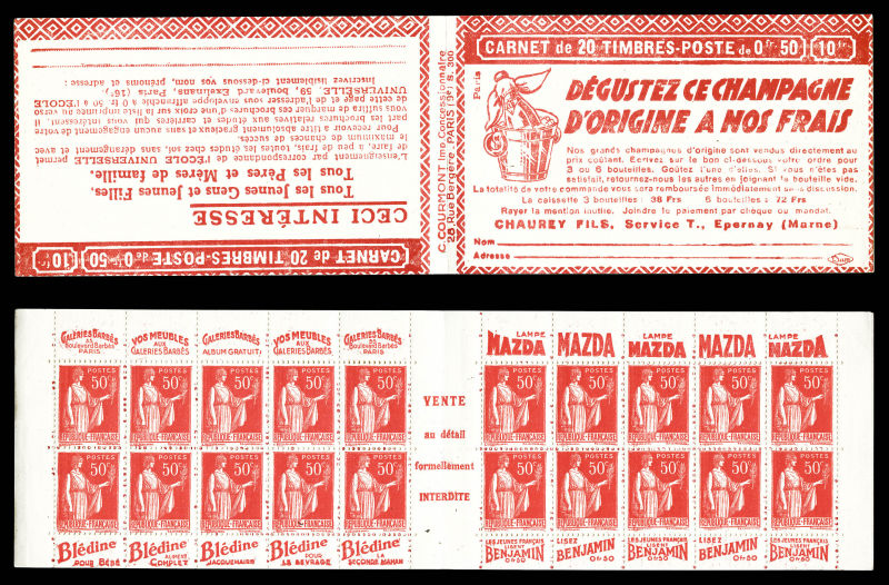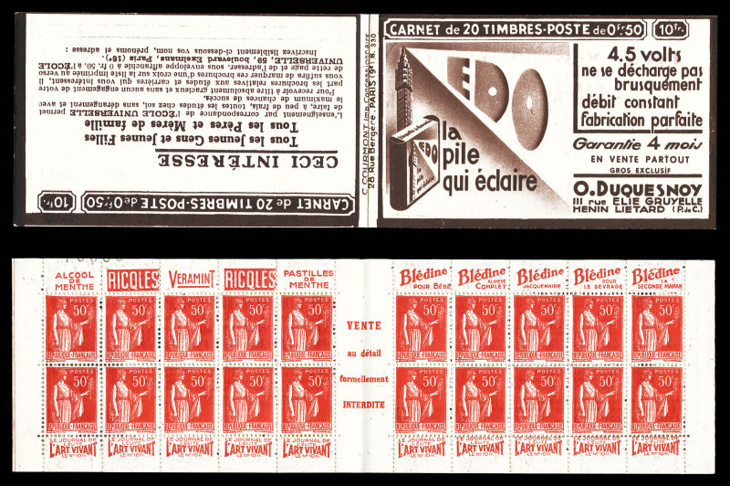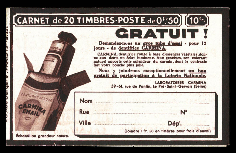 Série 321-B, DENTIFRICE CARMINA et EU, avec 1 timbre isolé au type 1 case 19, légère décalque sans importance au vue de la rareté de ce carnet. SUP. R.R. (certificat) Qualité: ** (Image) (image2)