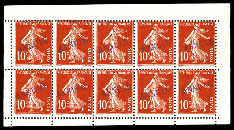 2139 imageN°138, 10c Semeuse: bloc de 10 de carnet surchargés ANNULE en violet (2ex*). TTB. R. (certificat) Qualité: ** Cote: 2444+ euros (Image)