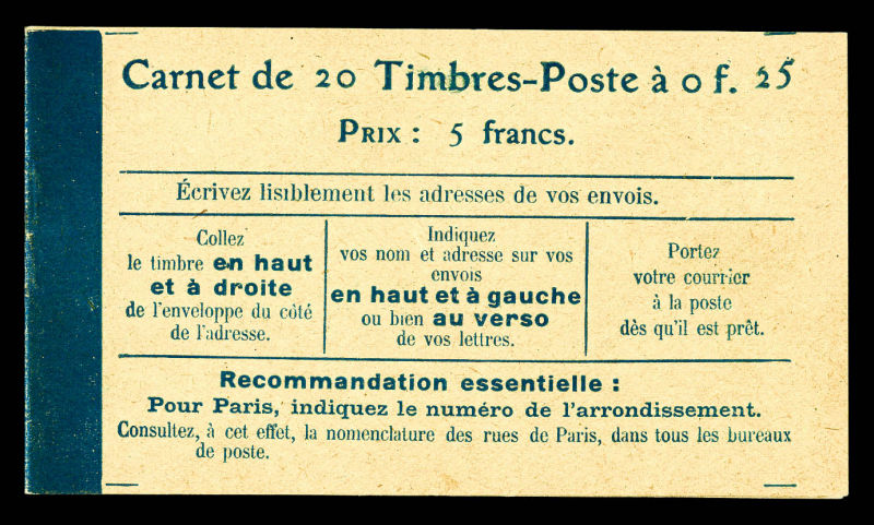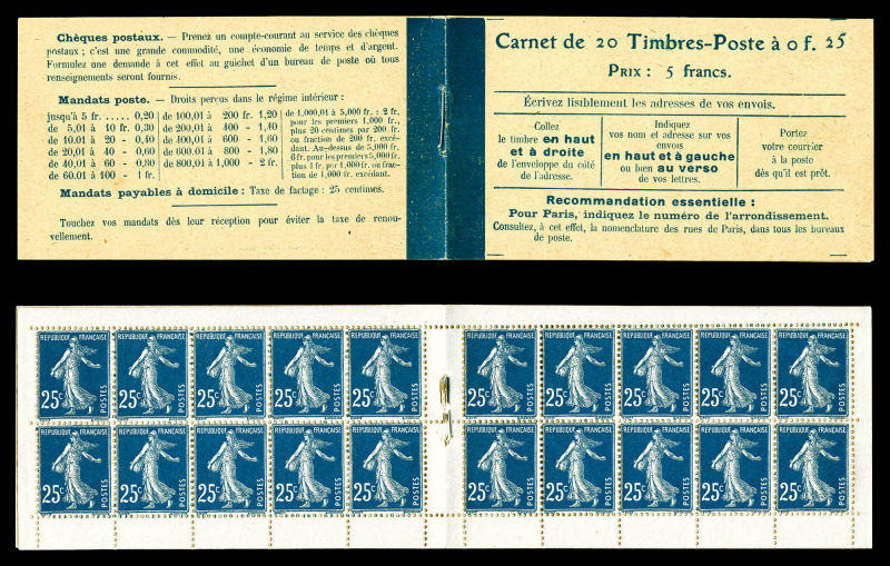 2140 imageN°140-C1, Semeuse, 25c bleu, carnet de 20 timbres, Prix: 5F, couverture postale. R.R.R et SUPERBE (certificat) Qualité: ** (Image) (image2) (All Images)
