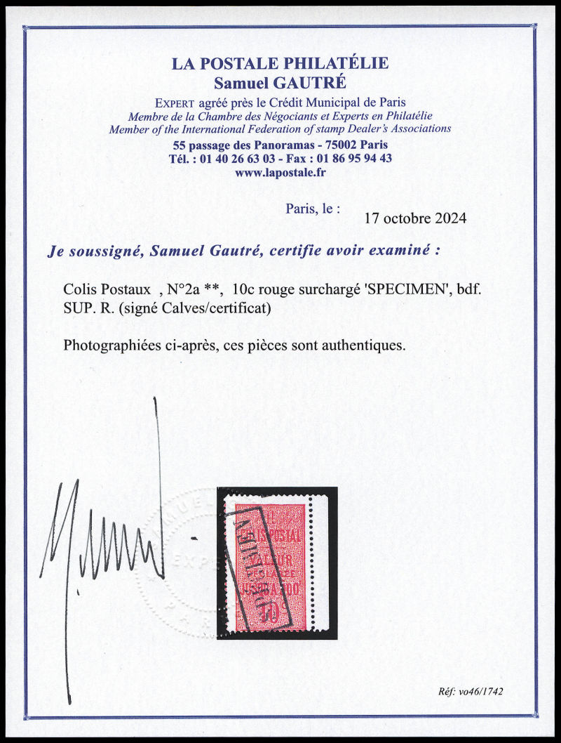 2286 imageN°2a, 10c rouge surchargé 'SPECIMEN', bdf. SUP. R. (signé Calves/certificat) Qualité: ** Cote: 2500 euros (Image) (image2) (All Images)