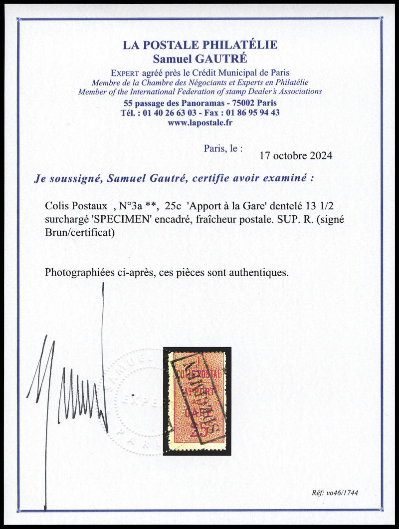 2287 imageN°3a, 25c 'Apport à la Gare' dentelé 13 1/2 surchargé 'SPECIMEN' encadré, fraîcheur postale. SUP. R. (signé Brun/certificat) Qualité: ** Cote: 2100 euros (Image) (image2) (All Images)