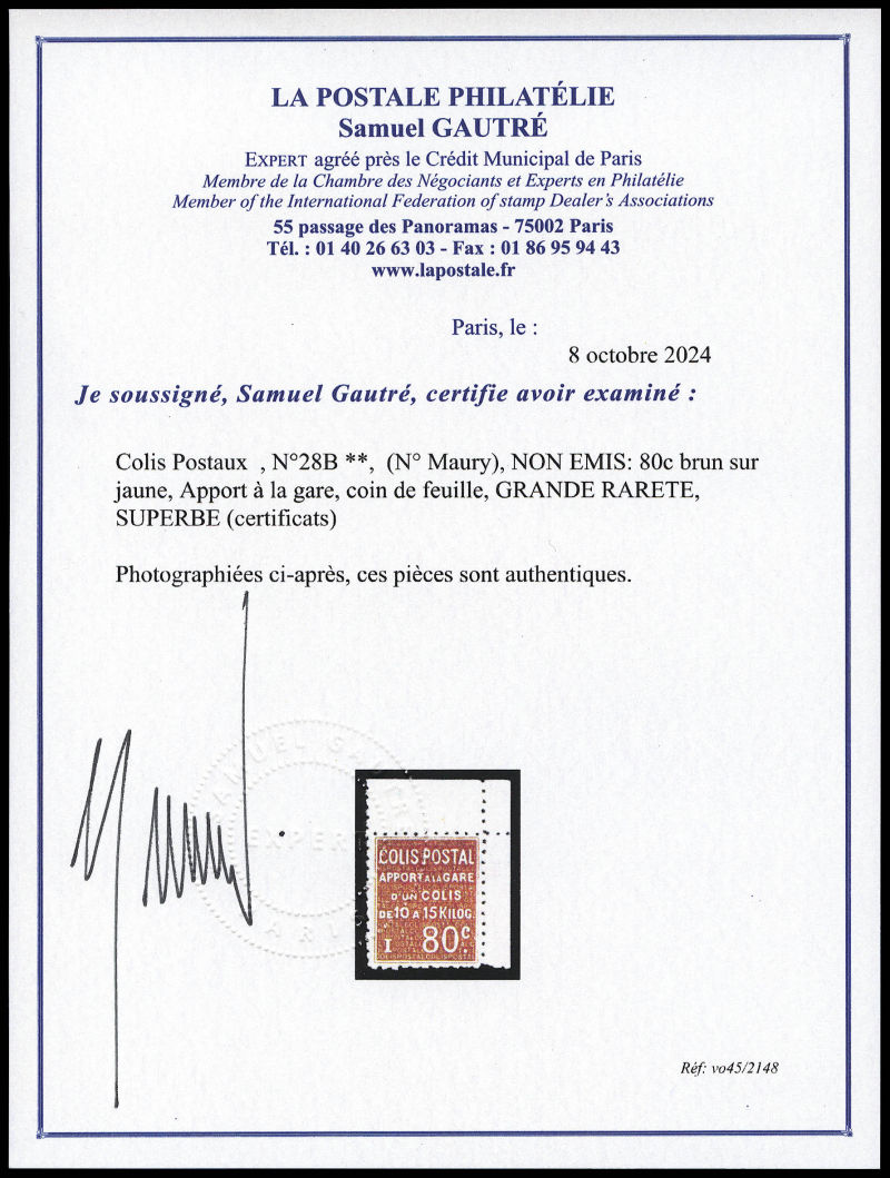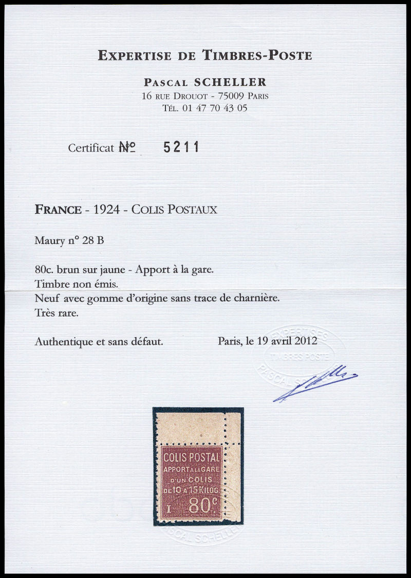 2296 imageN°28B, (N° Maury), NON EMIS: 80c brun sur jaune, Apport à la gare, coin de feuille, GRANDE RARETE, SUPERBE (certificats) Qualité: ** Cote: 11000 euros (Image) (image2) (image3) (All Images)