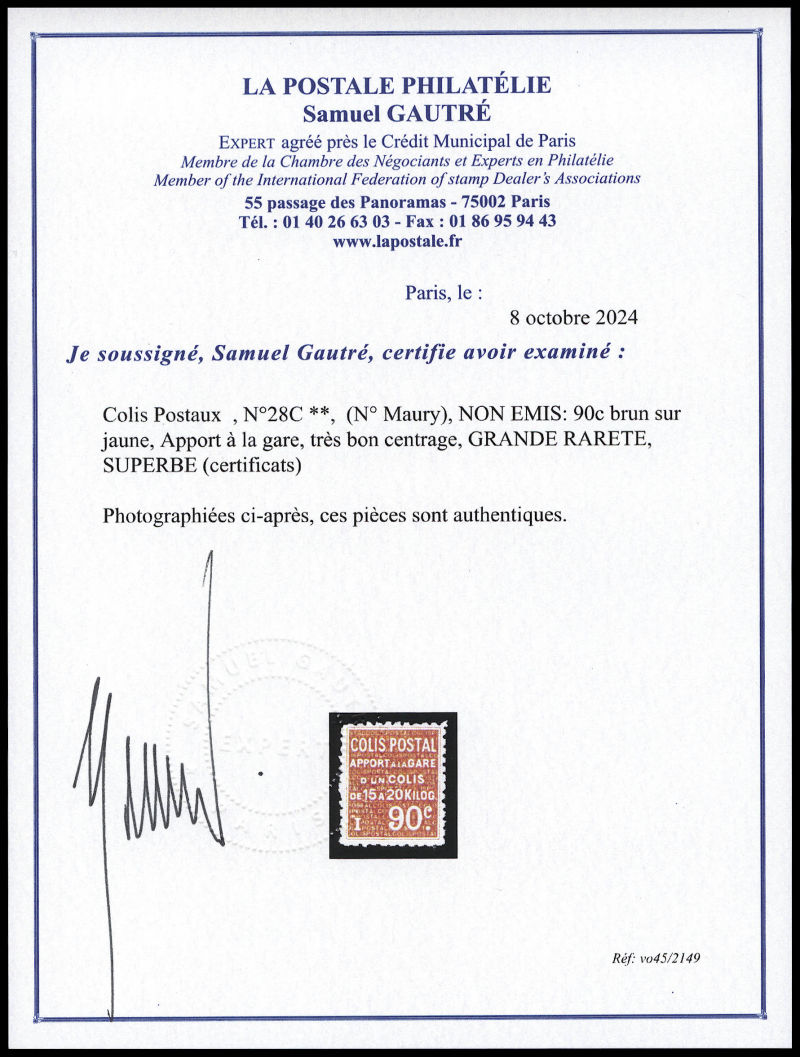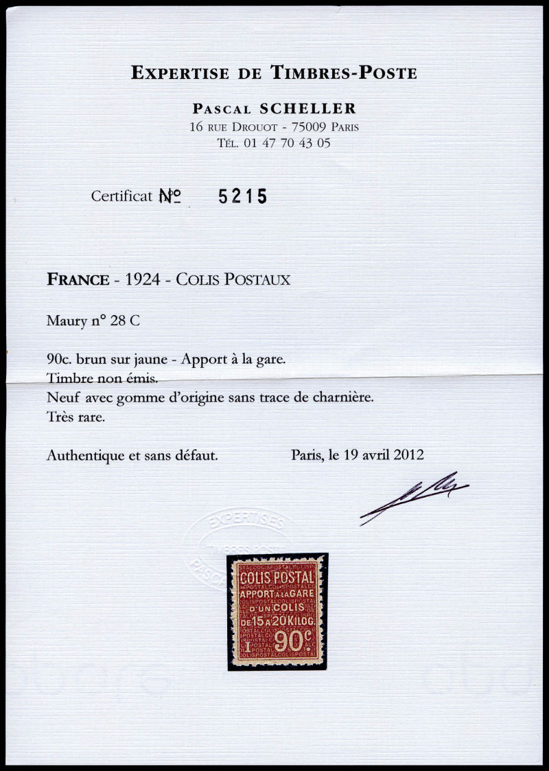 2297 imageN°28C, (N° Maury), NON EMIS: 90c brun sur jaune, Apport à la gare, très bon centrage, GRANDE RARETE, SUPERBE (certificats) Qualité: ** Cote: 11000 euros (Image) (image2) (image3) (All Images)