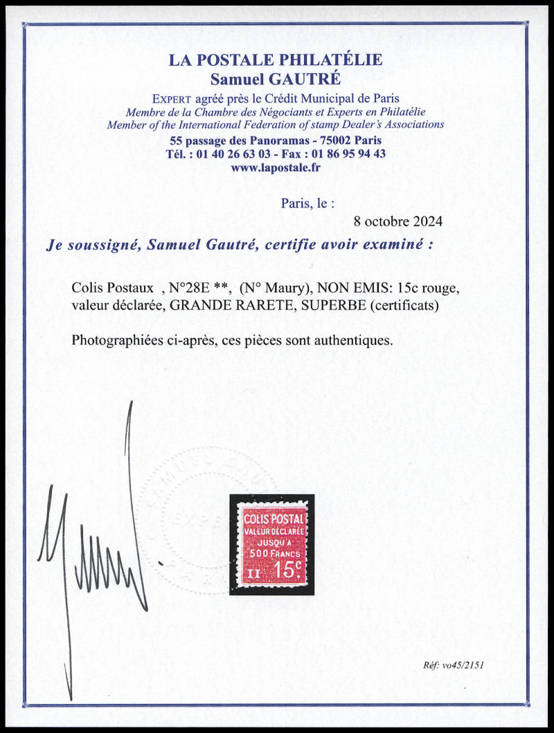 2299 imageN°28E, (N° Maury), NON EMIS: 15c rouge, valeur déclarée, GRANDE RARETE, SUPERBE (certificats) Qualité: ** Cote: 11000 euros (Image) (image2) (All Images)