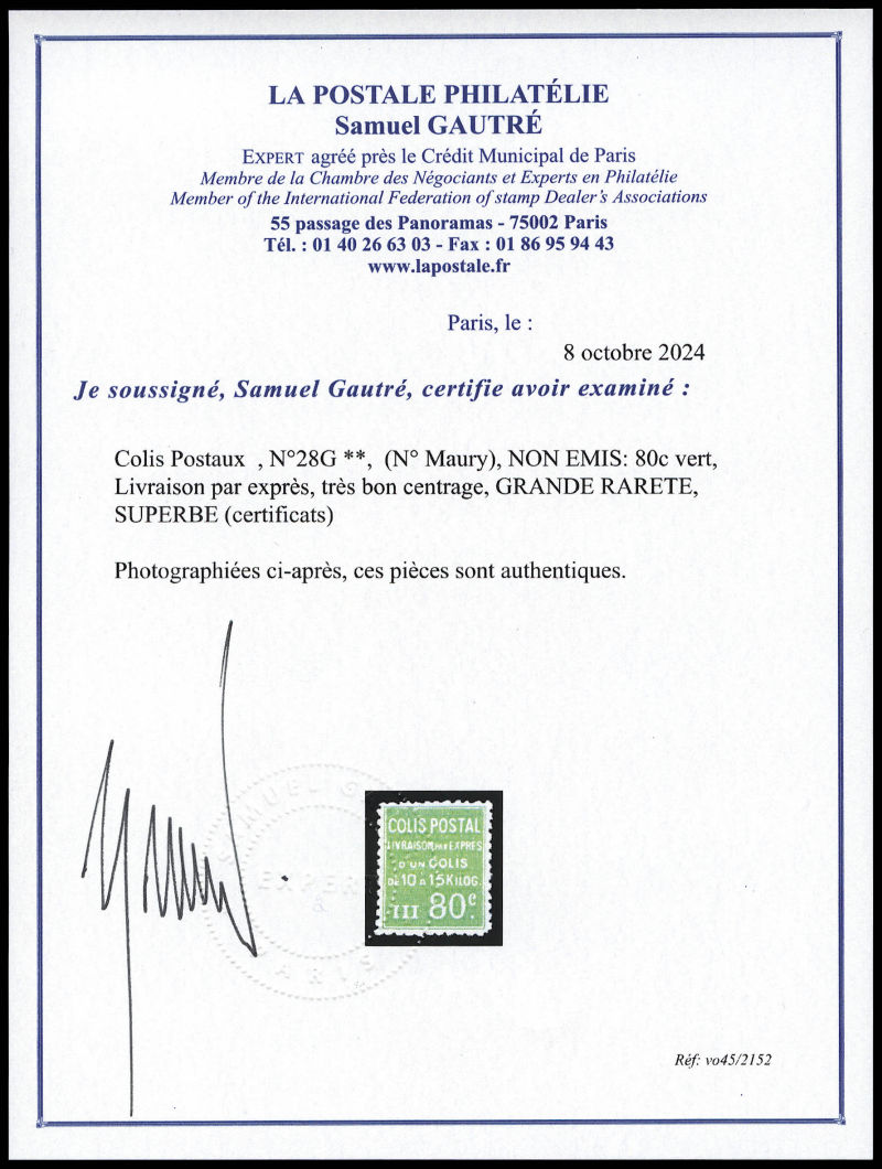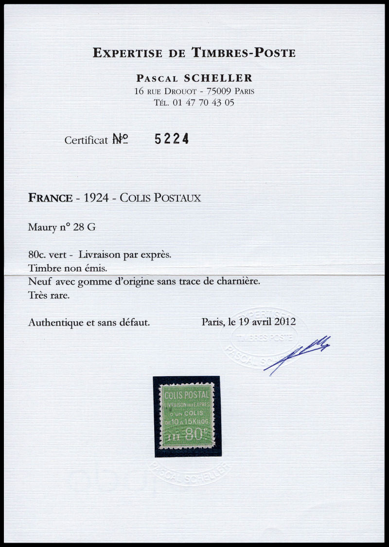 2300 imageN°28G, (N° Maury), NON EMIS: 80c vert, Livraison par exprès, très bon centrage, GRANDE RARETE, SUPERBE (certificats) Qualité: ** Cote: 11000 euros (Image) (image2) (image3) (All Images)