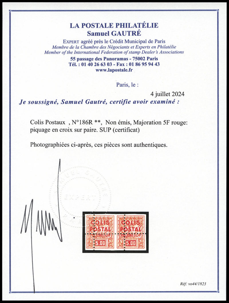 2341 imageN°186R, Non émis, Majoration 5F rouge: piquage en croix sur paire. SUP (certificat) Qualité: ** Cote: 1300 euros (Image) (image2) (All Images)