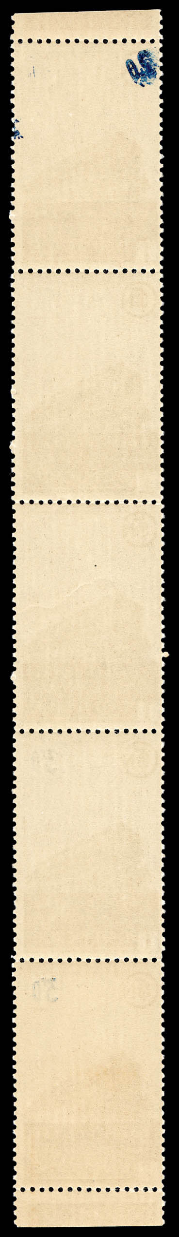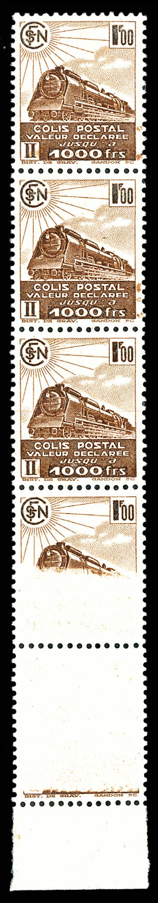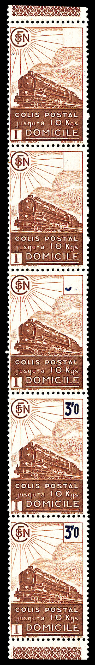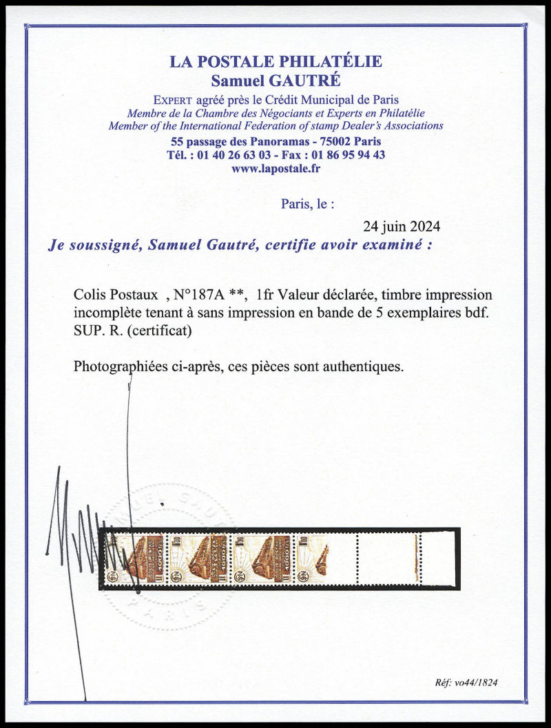 2342 imageN°187A, 1fr Valeur déclarée, timbre impression incomplète tenant à sans impression en bande de 5 exemplaires bdf. SUP. R. (certificat) Qualité: ** (Image) (image2) (All Images)