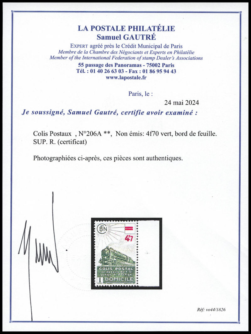 2344 imageN°206A, Non émis: 4f70 vert, bord de feuille. SUP. R. (certificat) Qualité: ** Cote: 2250 euros (Image) (image2) (All Images)