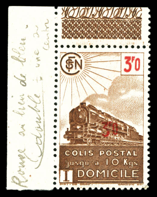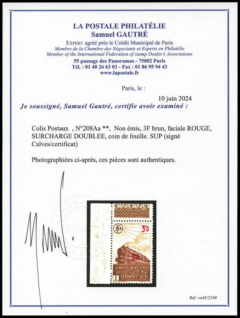 2345 imageN°208Aa, Non émis, 3F brun, faciale ROUGE, SURCHARGE DOUBLEE, coin de feuille. SUP (signé Calves/certificat) Qualité: ** Cote: 3000 euros (Image) (image2) (All Images)