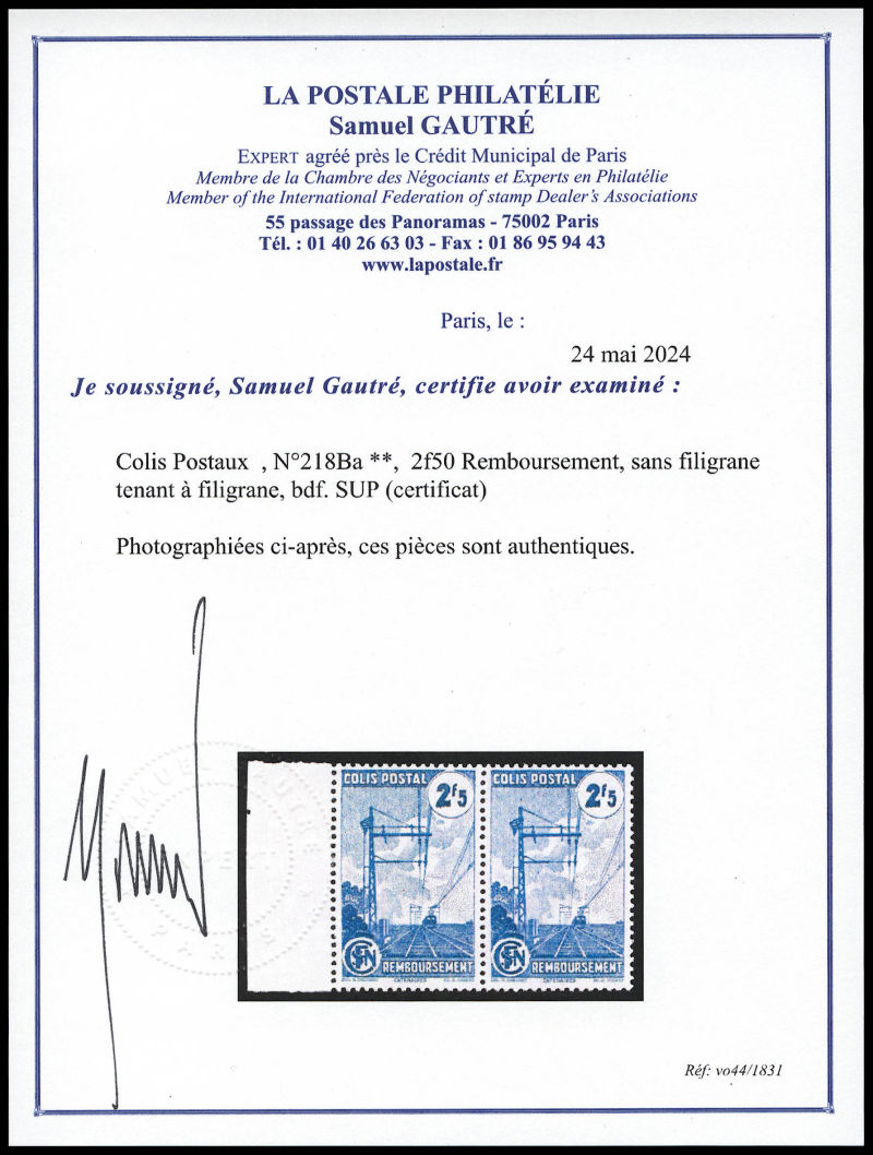 2349 imageN°218Ba, 2f50 Remboursement, sans filigrane tenant à filigrane, bdf. SUP (certificat) Qualité: ** Cote: 850 euros (Image) (image2) (All Images)