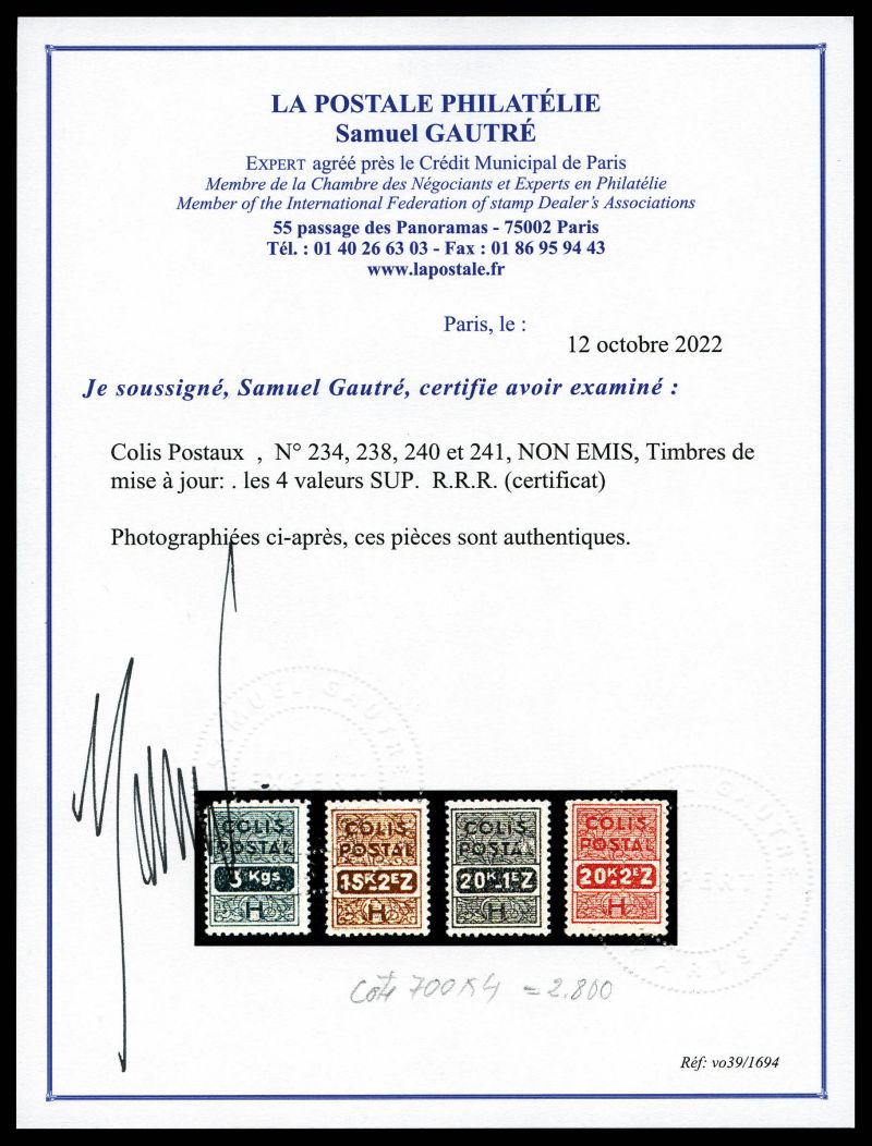 2352 imageN° 234, 238, 240 et 241, NON EMIS, Timbres de mise à jour: . les 4 valeurs SUP. R.R.R. (certificat) Qualité: ** Cote: 2800 euros (Image) (image2) (All Images)