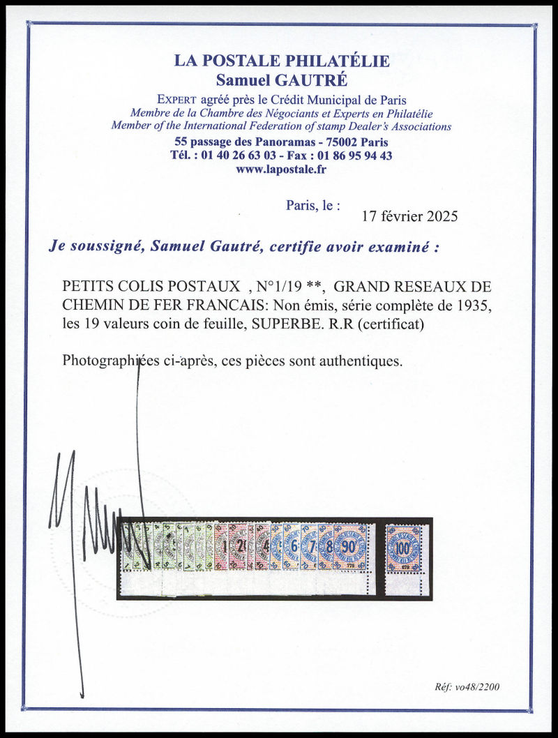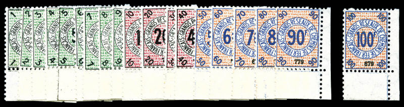 2354 imageN°1/19, GRAND RESEAUX DE CHEMIN DE FER FRANCAIS: Non émis, série complète de 1935, les 19 valeurs coin de feuille, SUPERBE. R.R (certificat) Qualité: ** Cote: 1800 euros (Image) (image2) (All Images)