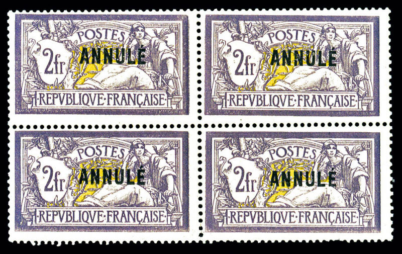 2375 imageN°122-CI 1, Merson, 2F violet et jaune surchargé 'ANNULE' en bloc de quatre. SUPERBE. R.R.R. (certificat) Qualité: ** Cote: 15200 euros (Image)