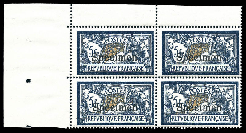 2379 imageN°123-CI 3, 5f Merson surchargé 'SPECIMEN', bloc de 4 cdf. SUP. R. (certificat) Qualité: ** Cote: 2000 euros (Image)