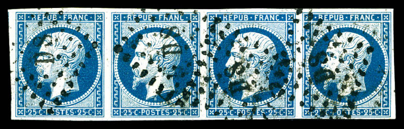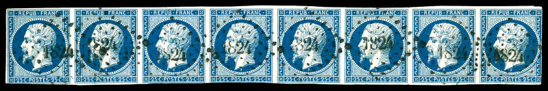 221 imageN°10, 25c bleu en bande horizontale de 8 exemplaires obl pc 1824, quelques défauts sans importance, très rare (certificat) Qualité: Oblitéré (Image)