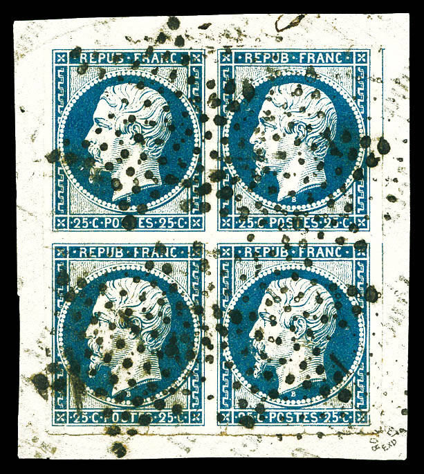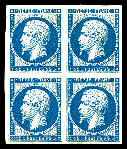226 imageN°10c, 25c bleu, impression de 1862 en bloc de quatre. TTB (certificat) Qualité: * Cote: 2800+ euros (Image)