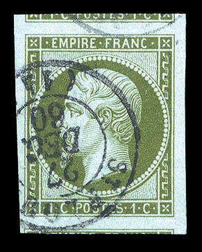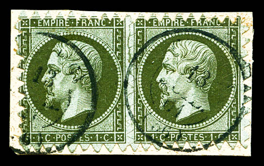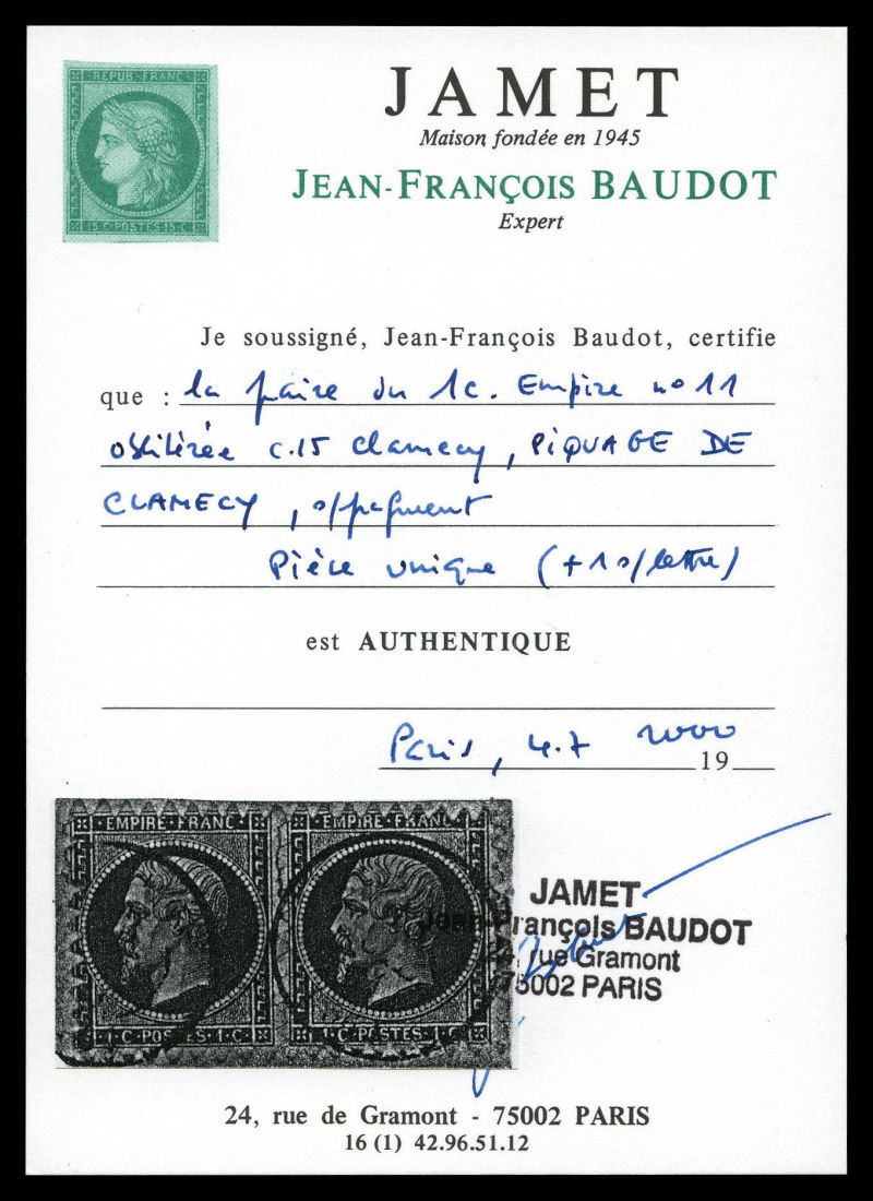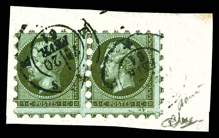 234 imageN°11, 1c olive: PIQUAGE DE CLAMECY en paire obl càd type 15 de Clamecy sur son support. PROBABLEMENT UNIQUE. SUPERBE. R.R.R. (signé/Certificats) Qualité: Oblitéré (Image) (image2) (All Images)