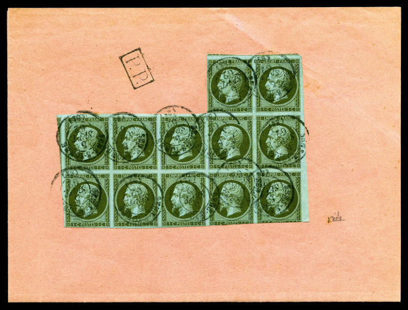 236 imageN°11, 1c olive, bloc de 12 exemplaires (2ex filet touché) obl càd de SENS + griffe 'PP' noire sur papier d'affaire du 5 sept 62 pour PONT SUR YONNE, très jolie pièce. R.R. (certificat) Qualité: Oblitéré (Image)