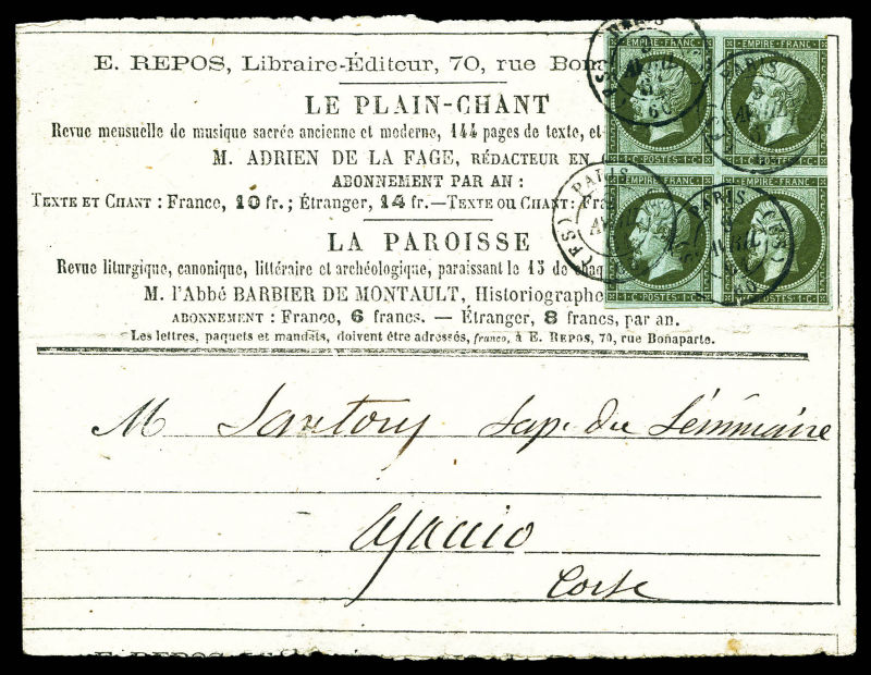 237 imageN°11, 1c olive, bloc de quatre obl càd de PARIS le 9 avril 61 sur bande journal pour Ajaccio, filet touché sur 2 exemplaires mais très frais. R (certificat) Qualité: Oblitéré Cote: 2700 euros (Image)