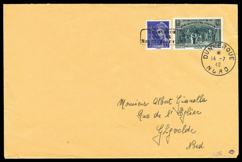2420 imageN°407 et 444 surchargés Dunkerque, oblitération du 14 juillet 1940 sur lettre, TB, signé Roumet Qualité: Oblitéré (Image)