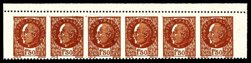 2450 imageAtelier des Faux: 1f 50 brun-foncé: Non dentelé vertical sur bande de 6 ex haut de feuille. TB Qualité: (*) Cote: 480 euros (Image)
