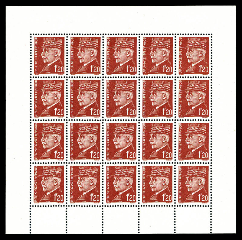 2453 imageN°8, FAUX DE LONDRES, 1f20 Pétain brun-rouge (N°515), bloc complet de 20 exemplaires. TB. R. (certificat) Qualité: * Cote: 900 euros (Image)