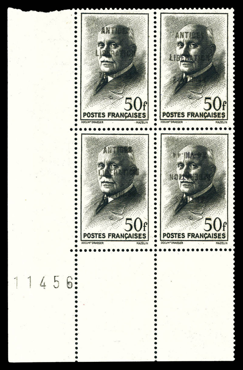 2457 imageN°37, ANTIBES (Vaucluse): 50f pétain, SURCHARGE RENVERSEE (position 22) tenant à normaux en bloc de 4 coin de feuille numéroté. SUPERBE. R. (certificat) Qualité: ** Cote: 4500 euros (Image)