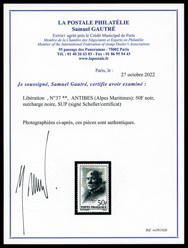 2458 imageN°37, ANTIBES (Alpes Maritimes): 50F noir, surcharge noire, SUP (signé Scheller/certificat) Qualité: ** Cote: 900 euros (Image) (image2) (All Images)