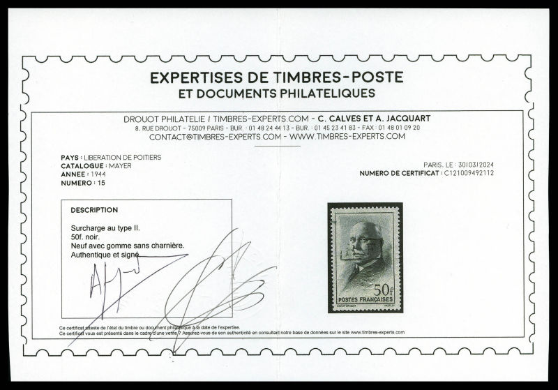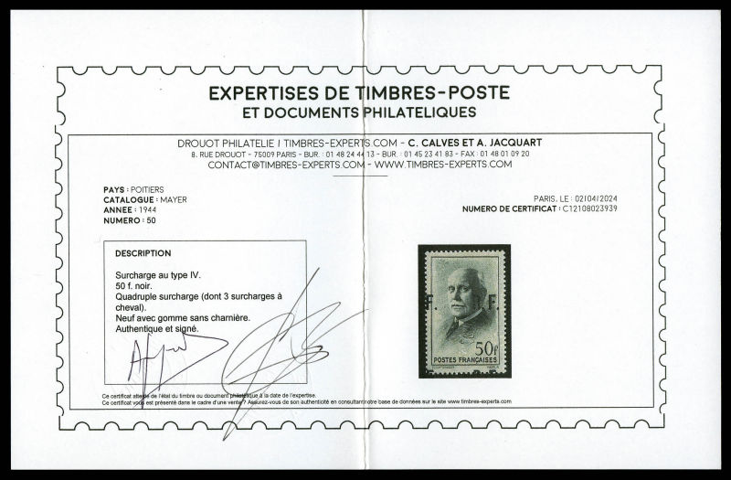 2522 imageN°15, POITIERS: Pétain, 50F noir surchargé type II, très bon centrage, fraîcheur postale, superbe et rare (signé Calves/certificats) Qualité: ** Cote: 2100 euros (Image) (image2) (image3) (All Images)