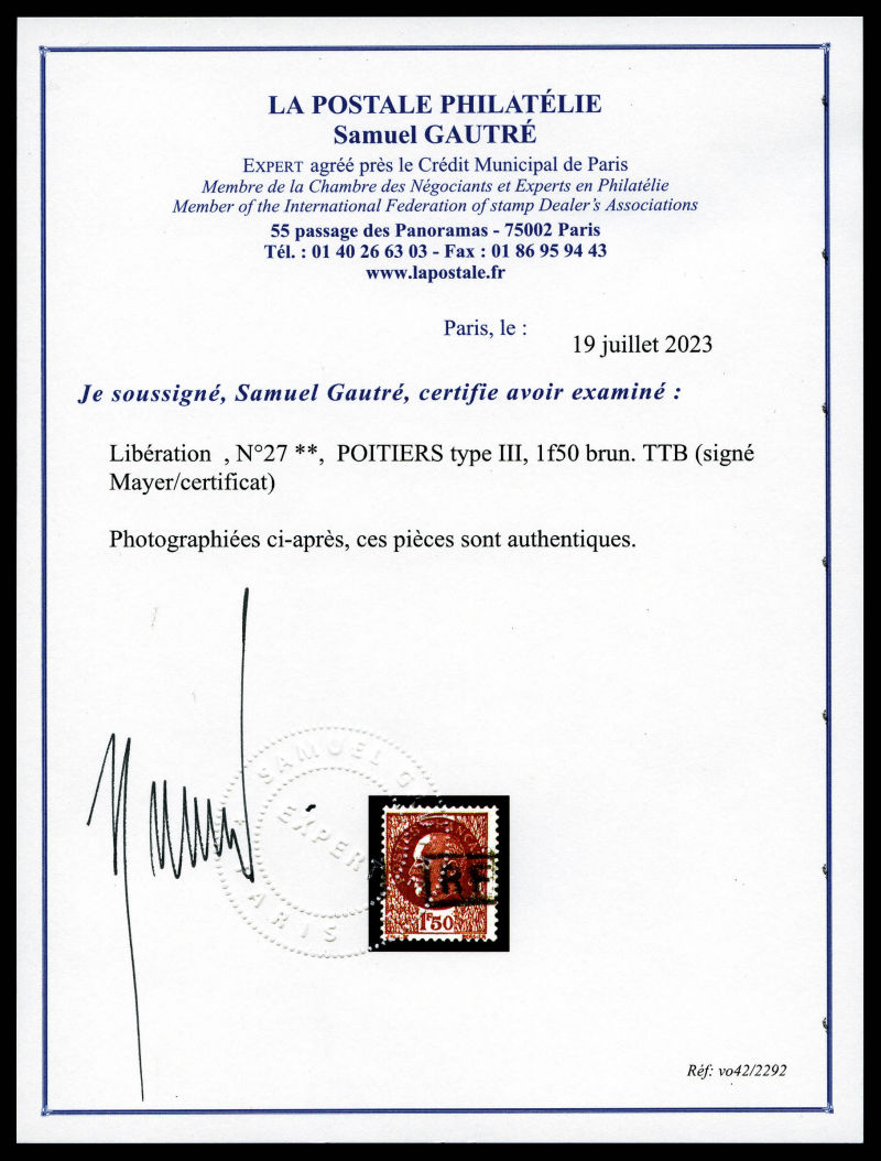 2523 imageN°27, POITIERS type III, 1f50 brun. TTB (signé Mayer/certificat) Qualité: ** Cote: 660 euros (Image) (image2) (All Images)