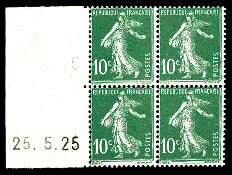 2581 imageN°159, 10c Semeuse type IV, bloc de quatre bord de feuille latéral gauche daté du 25.5.26. (1ex*). TTB (certificat) Qualité: ** Cote: 800 euros (Image)
