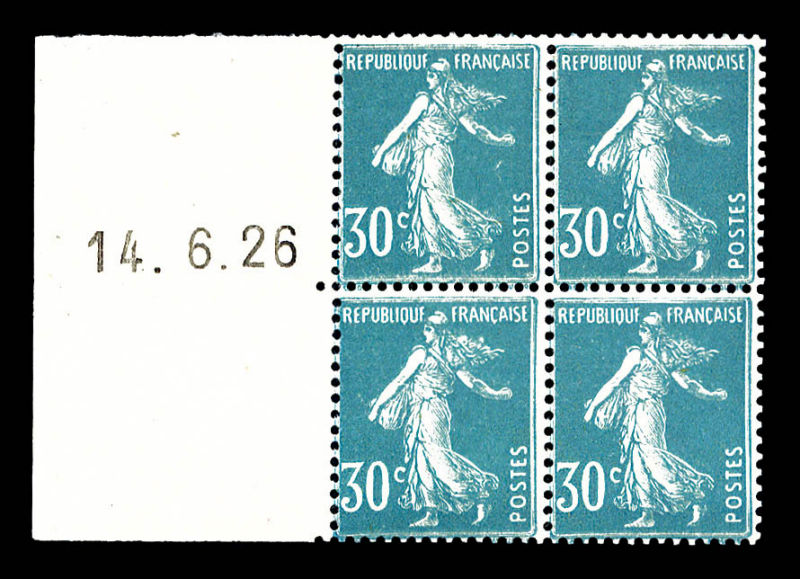 2582 imageN°192C, 30c bleu Semeuse, type IIC en bloc de quatre avec bord de feuille daté à gauche du 14.6.26, provenant de feuille pour roulettes. SUPERBE. R.R. (certificat) Qualité: ** Cote: 6000 euros (Image)
