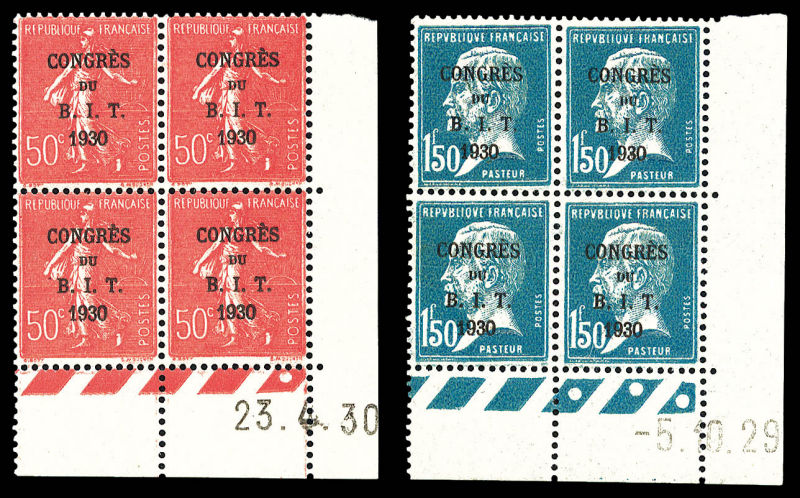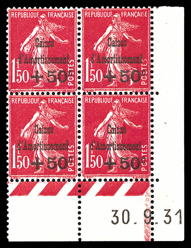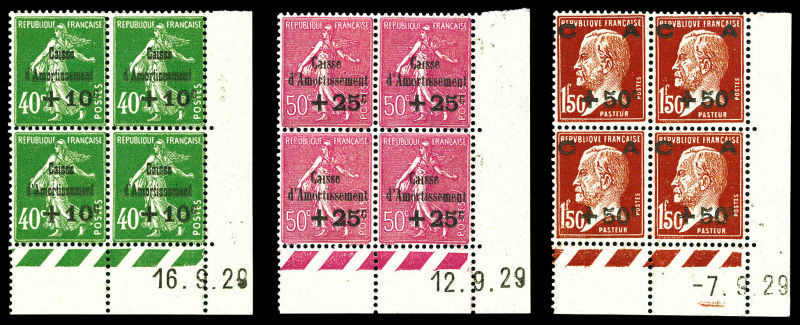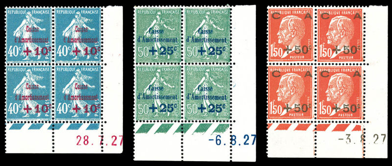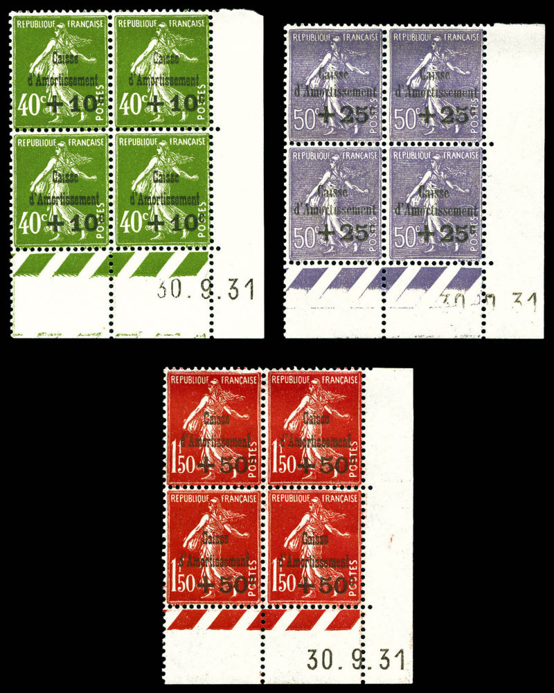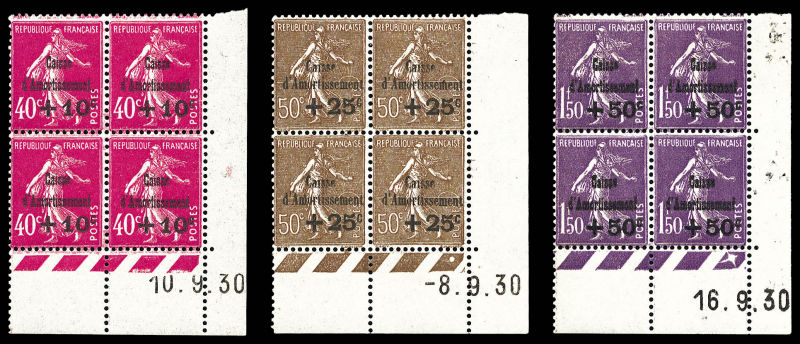 2595 imageN°275/277, Série Caisse d'Amortissement, les 3 valeurs en blocs de quatre coins de feuilles datés, très bon centrage. SUPERBE. R. (certificat) Qualité: ** Cote: 3400 euros (Image)