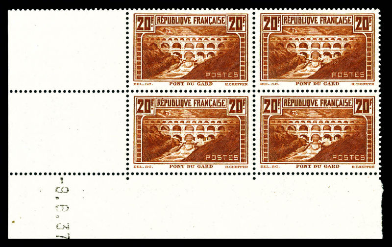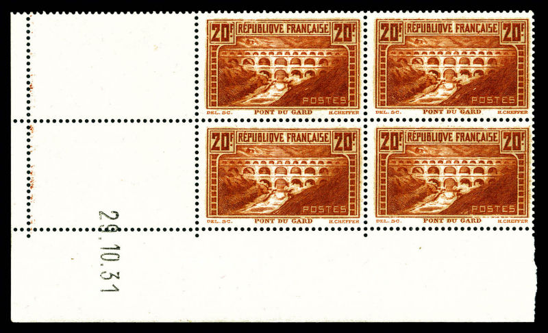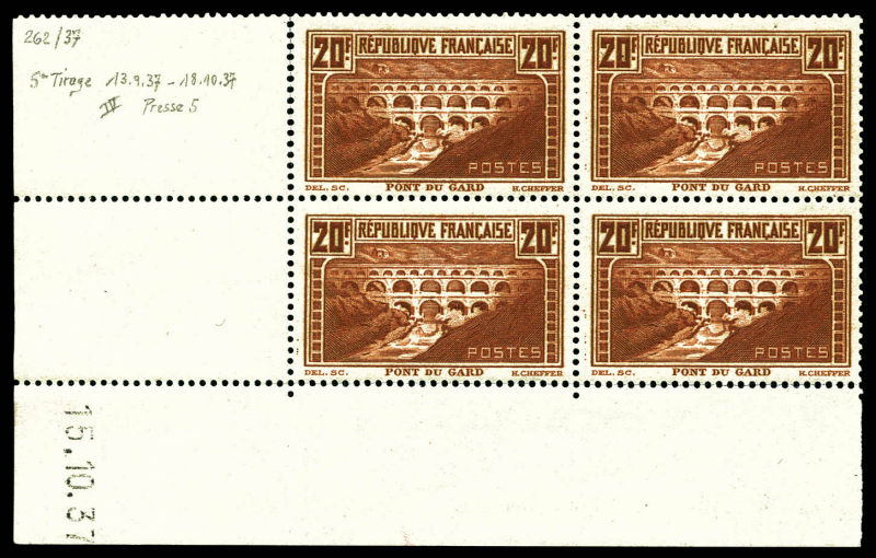 2590 imageN°262, Pont du Gard, 20F chaudron foncé type IIB en bloc de 4 coin de feuille daté du 15/10/1937 (bdf partiellement détaché), SUP (certificat) Qualité: ** Cote: 2800 euros (Image)