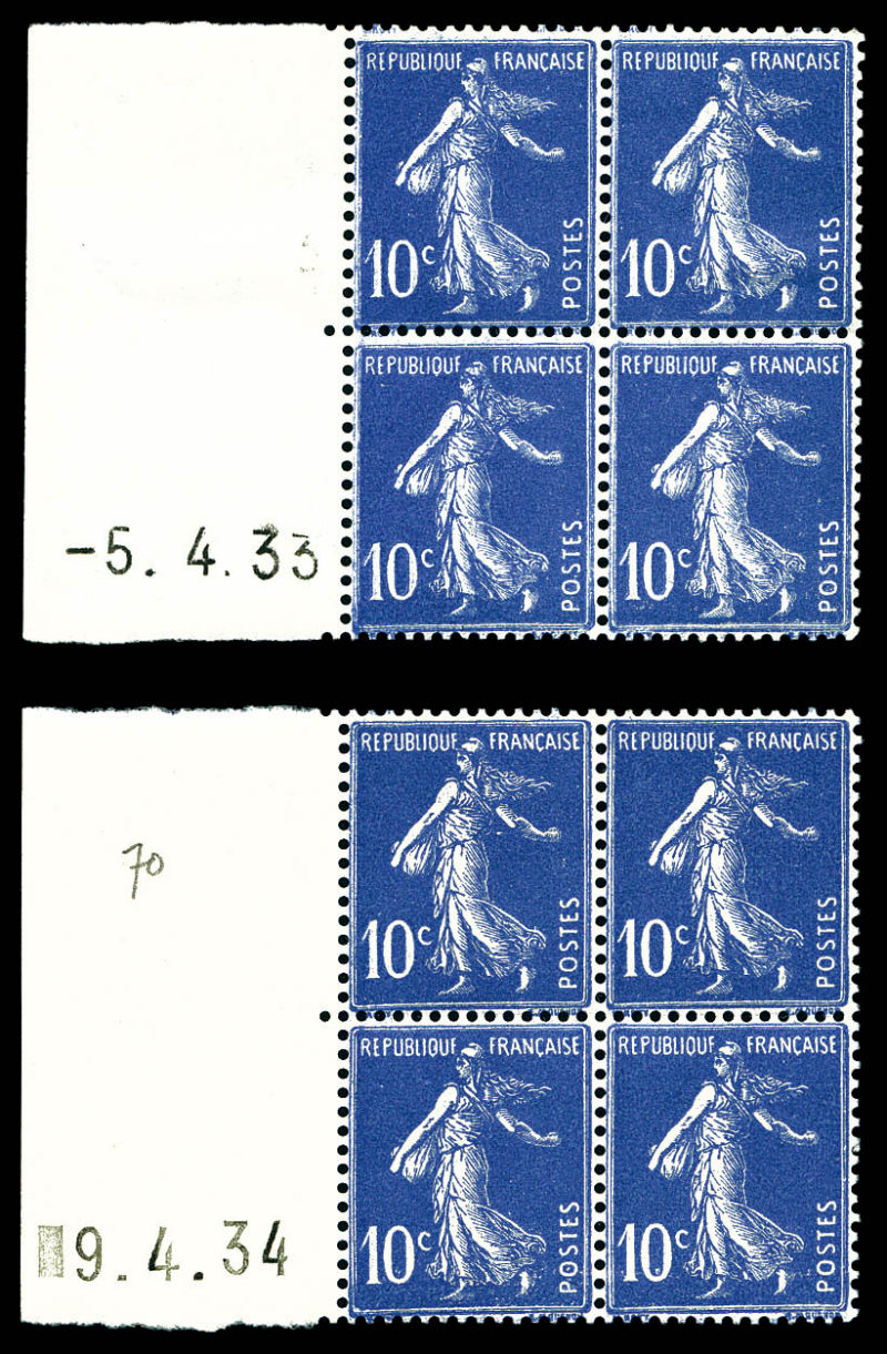 2597 imageN°279, 10c Semeuse: 2 exemplaires en bd4 bord de feuilles coins datés à gauche: 33 (*sur bdf) et 34. TTB Qualité: ** Cote: 270 euros (Image)
