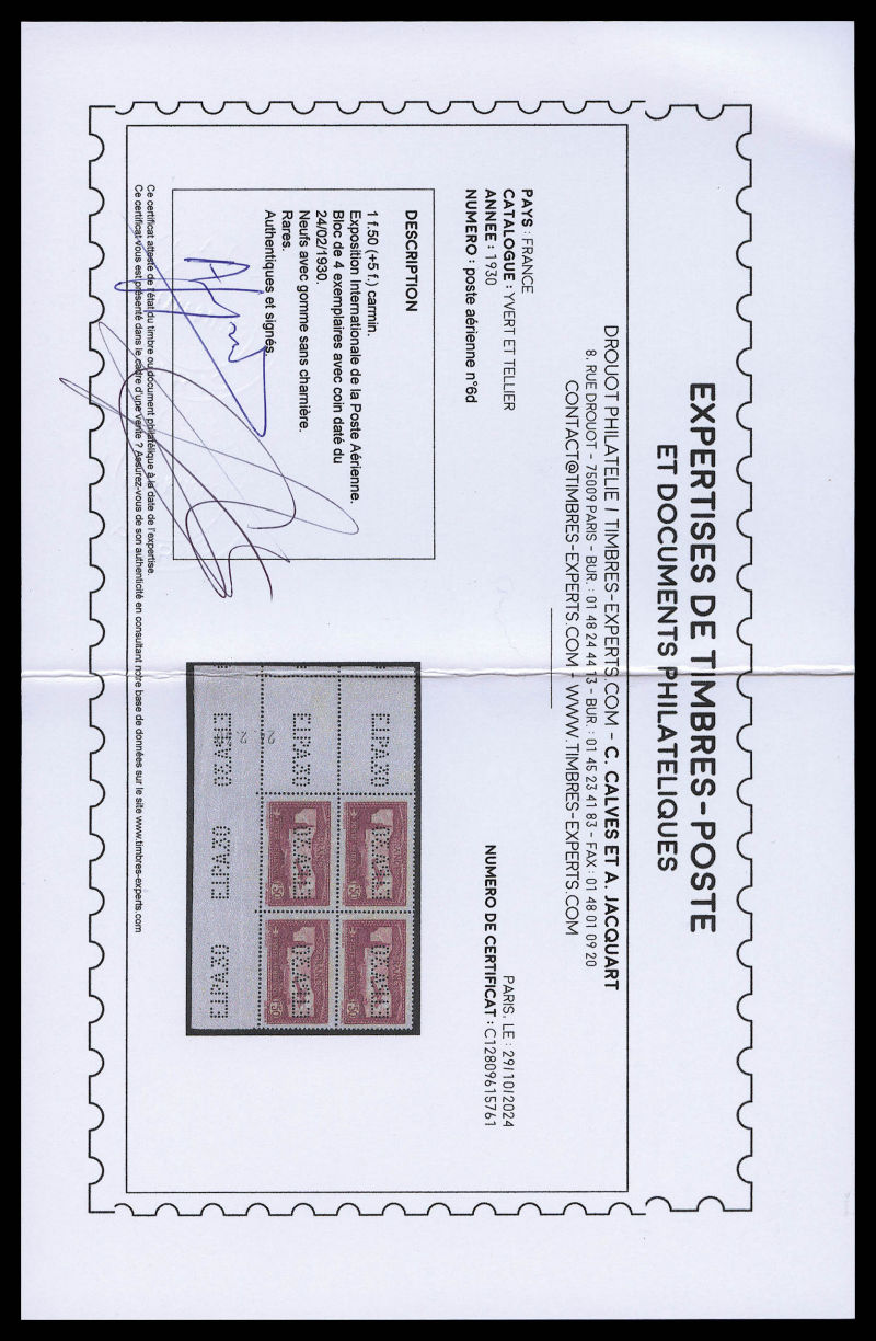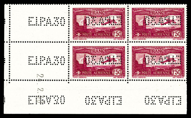 2611 imageN°6d, 1F50 carmin perforé E.I.P.A.30 en bloc de quatre coin de feuille daté du 24-2-1930. SUPERBE. R.R.R (signé/certificat) Qualité: ** Cote: 27500 euros (Image) (image2) (All Images)