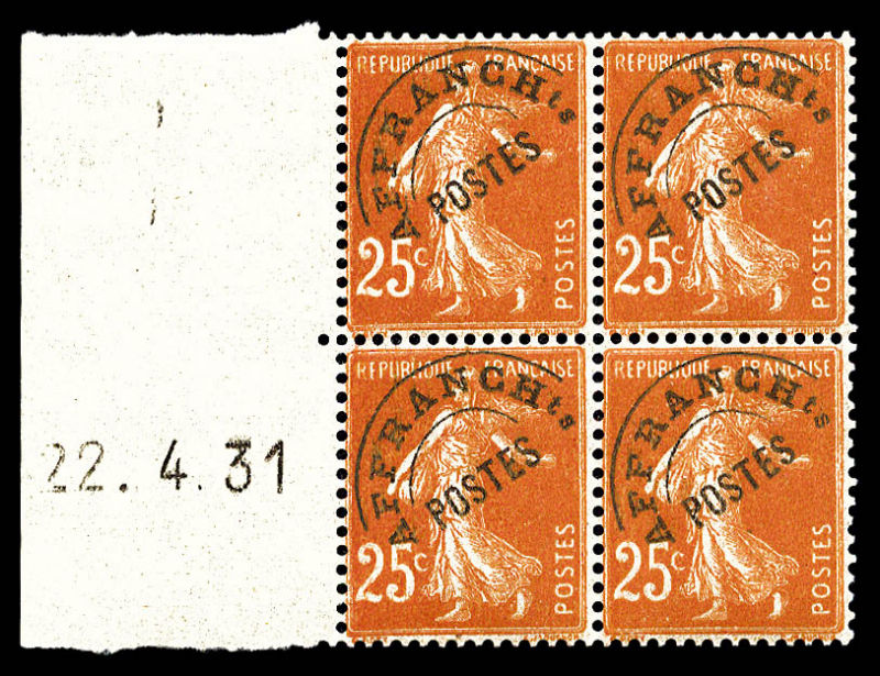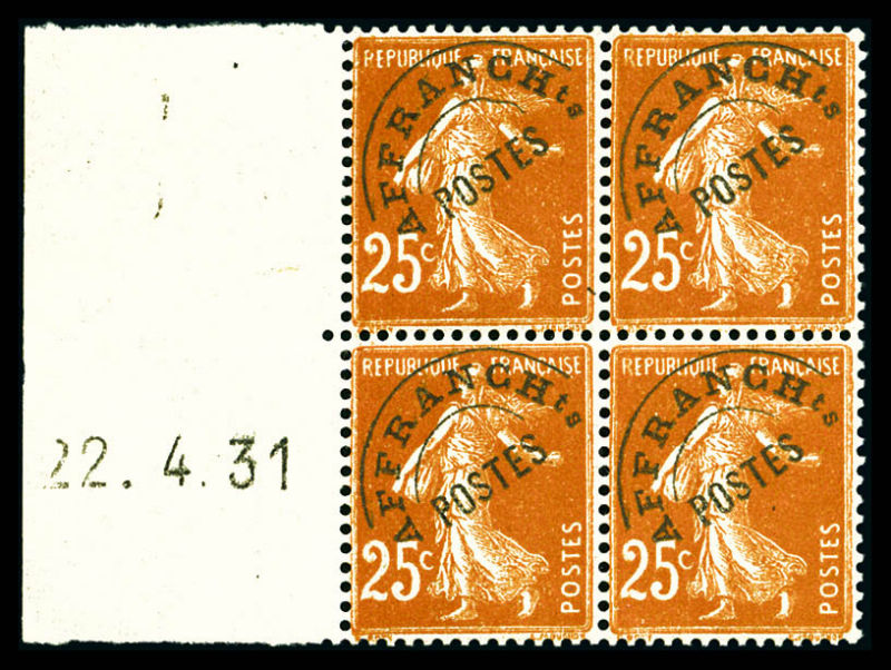 2613 imageN°57, 25c Semeuse, bloc de quatre bord de feuille latéral gauche daté du 22.4.31. TTB (certificat) Qualité: ** Cote: 650 euros (Image)