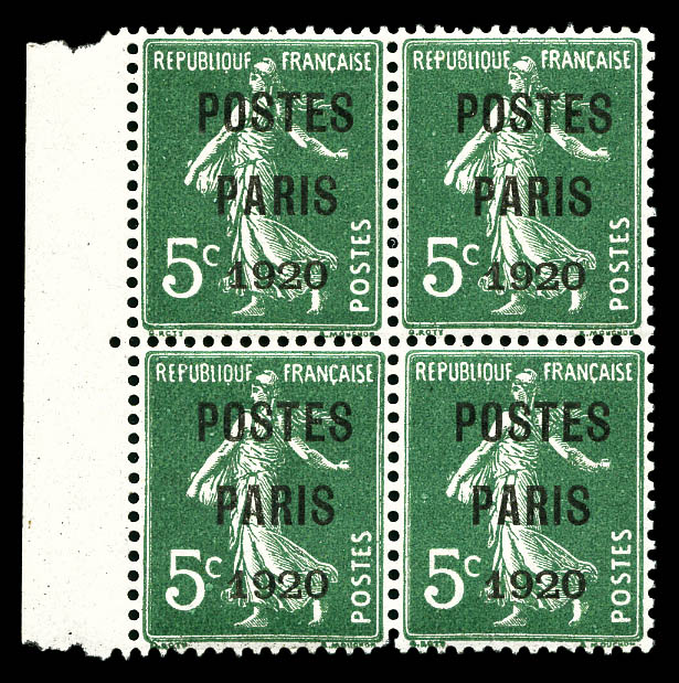 2616 imageN°24, 5c vert surchargé 'POSTES PARIS 1920' en bloc de quatre bdf , bon centrage. SUP (signé Brun/certificat) Qualité: ** Cote: 3400 euros (Image)