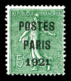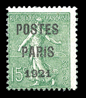 2618 imageN°28, 15c vert-olive surchargé 'POSTES PARIS 1921', frais, SUP. R.R. (certificat) Qualité: ** Cote: 1750 euros (Image) (image2) (All Images)