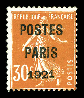 2620 imageN°29d, 30c orange surchargé POSTE PARIS 1921 avec 2ème 1 de 1921 surélevé. TTB. R. (certificat) Qualité: (*) Cote: 1300 euros (Image)