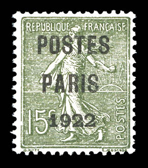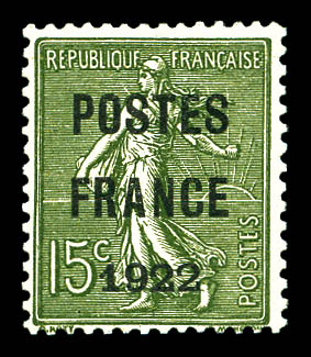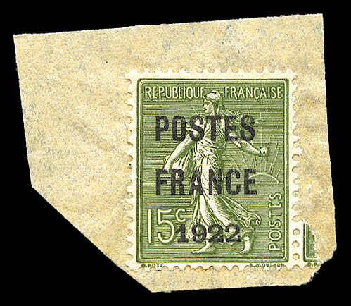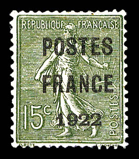 2633 imageN°37, 15c olive surchargé 'POSTE FRANCE 1922', très frais. SUP (signé Brun/certificat) Qualité: * Cote: 1400 euros (Image) (image2) (All Images)