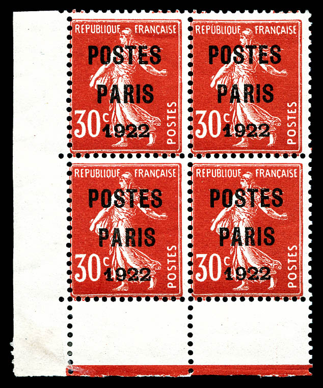2624 imageN°32, 30c rouge surchargé 'POSTE PARIS 1922' en bloc de quatre coin de feuille, grande fraîcheur. SUP. R.R. (certificat) Qualité: ** Cote: 5400 euros (Image)