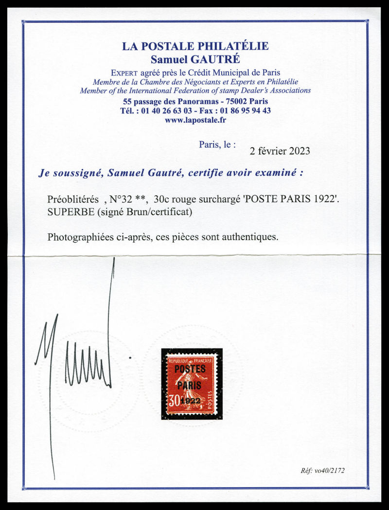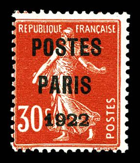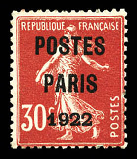 2626 imageN°32, 30c rouge surchargé 'POSTE PARIS 1922', petites imperfection de gomme sinon TB (certificat) Qualité: * Cote: 750 euros (Image)