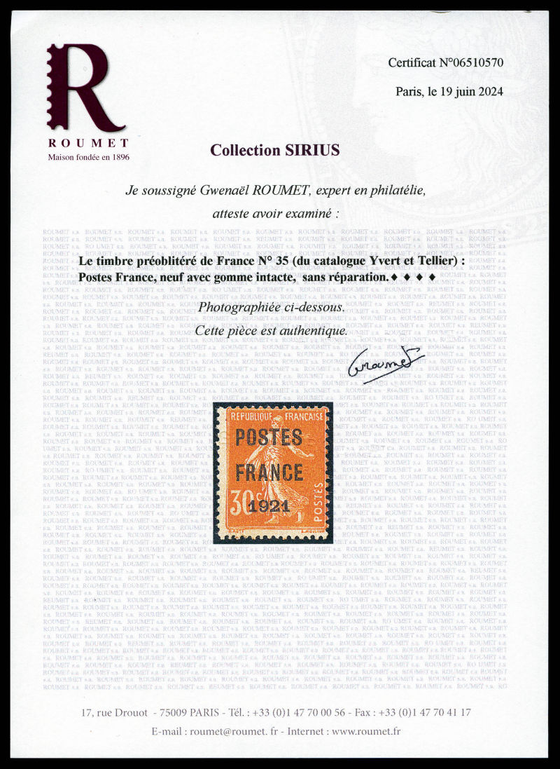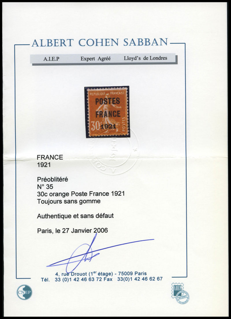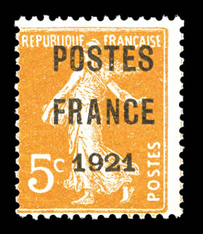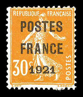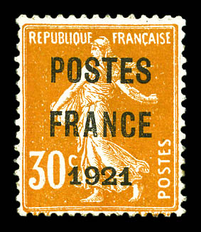 2629 imageN°35, 30c orange surchargé 'POSTES FRANCE 1921', grande fraîcheur, RARE et SUPERBE (signé Brun/certificats) Qualité: (*) Cote: 7000 euros (Image) (image2) (image3) (All Images)